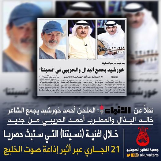الاخبار نقلاً عن الأنباء: الملحن أحمد خورشيد يجمع الشاعر خالد البذال والمطرب أحمد الحريبي من جديد أكتوبر 17, 2021