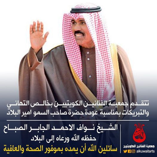 الاخبار نقدم جمعية الفنانين لكويتيين بخالص التهانى والتبريكات بمناسبة عودة حضرة صاحب السمو امير البلاد الشيخ نواف الاحمد الجابر الصباح حفظه الله ورعاه إلى البلاد سائلين الله أن يمده بموفور الصحة والعافية أكتوبر 17, 2021