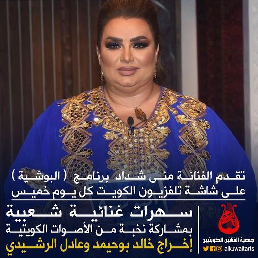 الاخبار تقدم الفنانة منى شداد برنامج البوشية) على شاشة تلفزيون يزنون الكويت كل يوم خميس سهرات غنائية شعبية بمشاركة نخبة من الأصوات الكويتية إخراج خالد بوحيمد وعادل الرشيدي أكتوبر 17, 2021