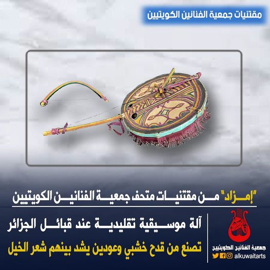 الاخبار “إمزاد” من مقتند مقتنيات متحف جمعية الفنانين الكويتيين آلة موسيقية تقليدية عند قبائل الجزائر تصنع من قدح خشبي وعودين يشد بينهم شعر الخيل أكتوبر 26, 2021